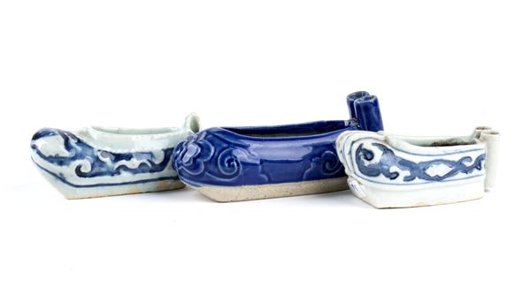 THREE PORCELAIN SHOE-SHAPED BIRD FEEDERS