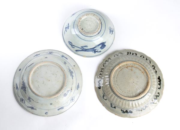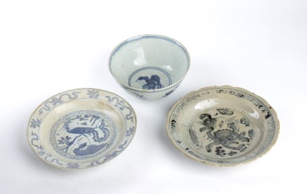 TWO 'BLUE AND WHITE' PORCELAIN SMALL DISHES AND A 'BLUE AND WHITE' PORCELAIN BOWL