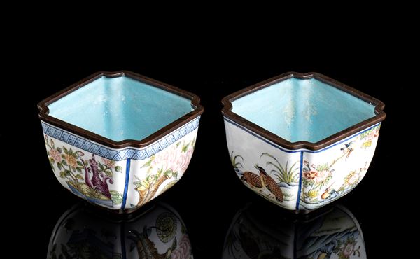 TWO POLYCHROME ENAMELLED METAL BOWLS