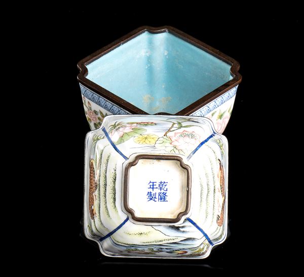One with compositions of objects, the other with compositions of flowers and birds, both with Qianlong apocryphal mark to the center of the base.