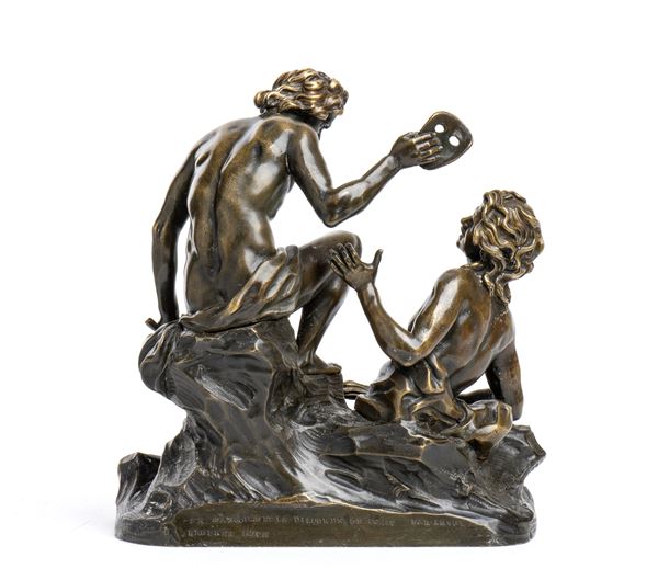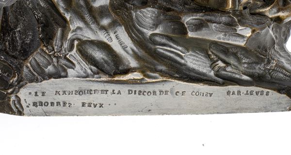 From a stylistic point of view, this representation refers to similar compositions of the Baroque or late Baroque Tuscan school. For example, the way of treating the clod of ground on which the figures stand out recalls the ways of Soldani Benzi, while la greenish patina and the writing in French they push us towards France.