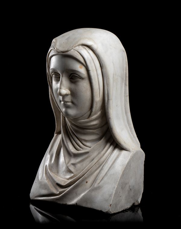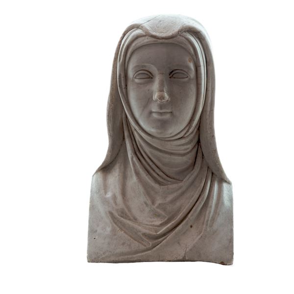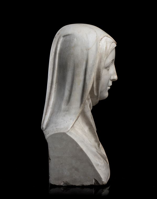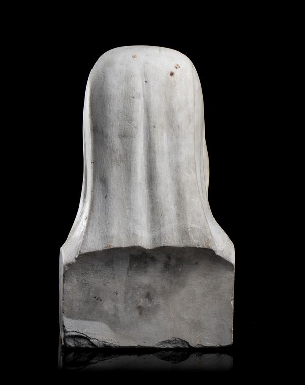 This bust depicts a veiled young woman, perhaps a vestal. The first stylistic reference is a similar bust created by Antonio Canova (now in the Gallery of Modern Art in Milan) which has the same veil wrapped up around the neck and similar absorbed expression.
