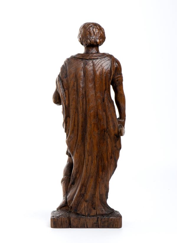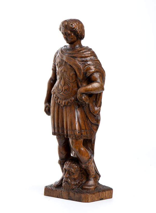 David represented in ancient Roman lorica with the severed head of Goliath between his legs.