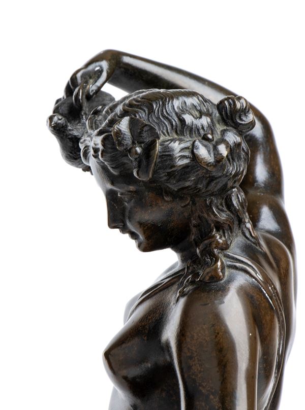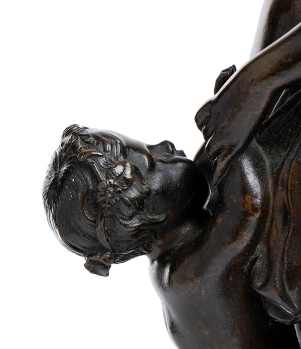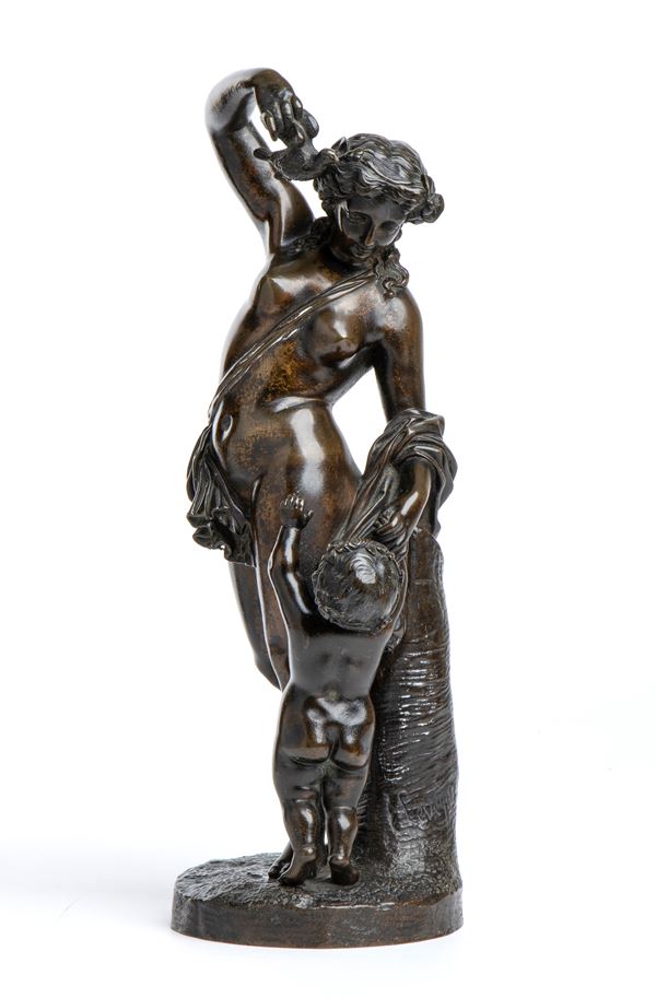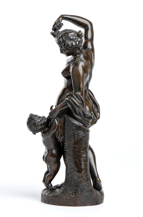 The small sculpture represents a goddess with a putto. She holds a dove by the wings, the traditional symbol of Venus, twisting her bust towards the child.