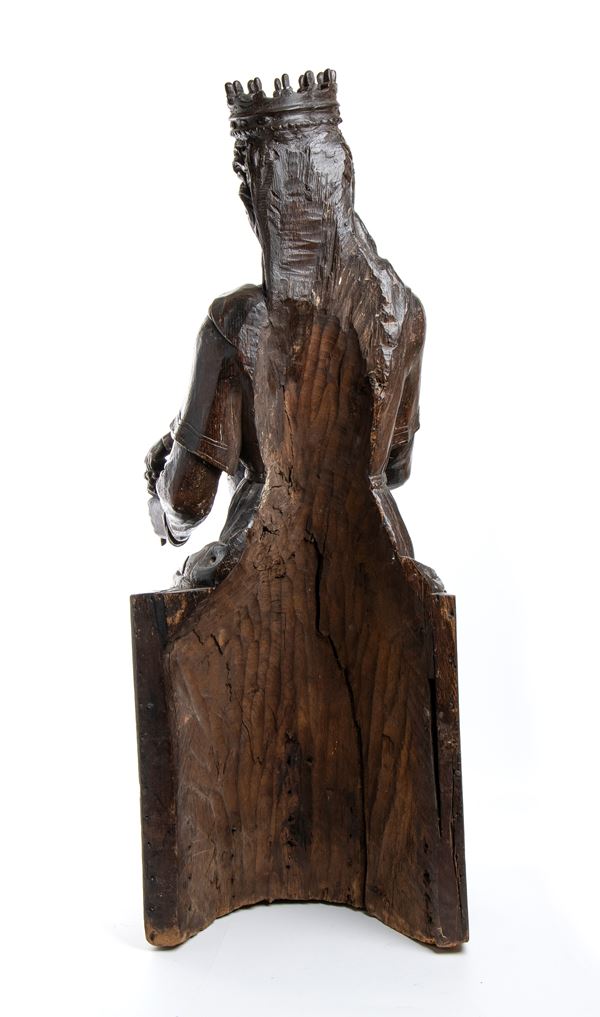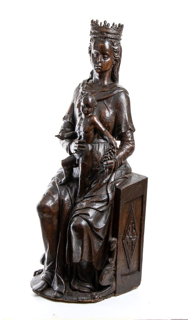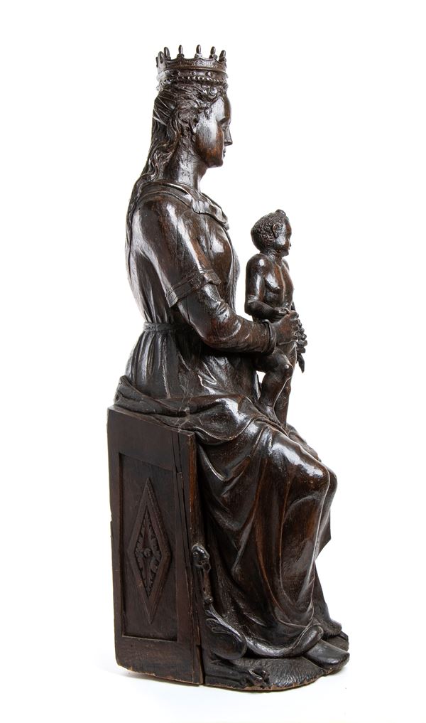 The imposing sculpture represents a subject widespread in northern Europe, particularly in the Valtellina area. The Madonna is depicted as a queen, seated on a throne with simple but elegant Renaissance-style decorations. She velds a standing naked Child with a bunch of grapes in his hand. There are some similarities with the lost sculpture from the oratory of San Rocco al Ponte a Sondalo. The sculpture is hollowed out on the back.