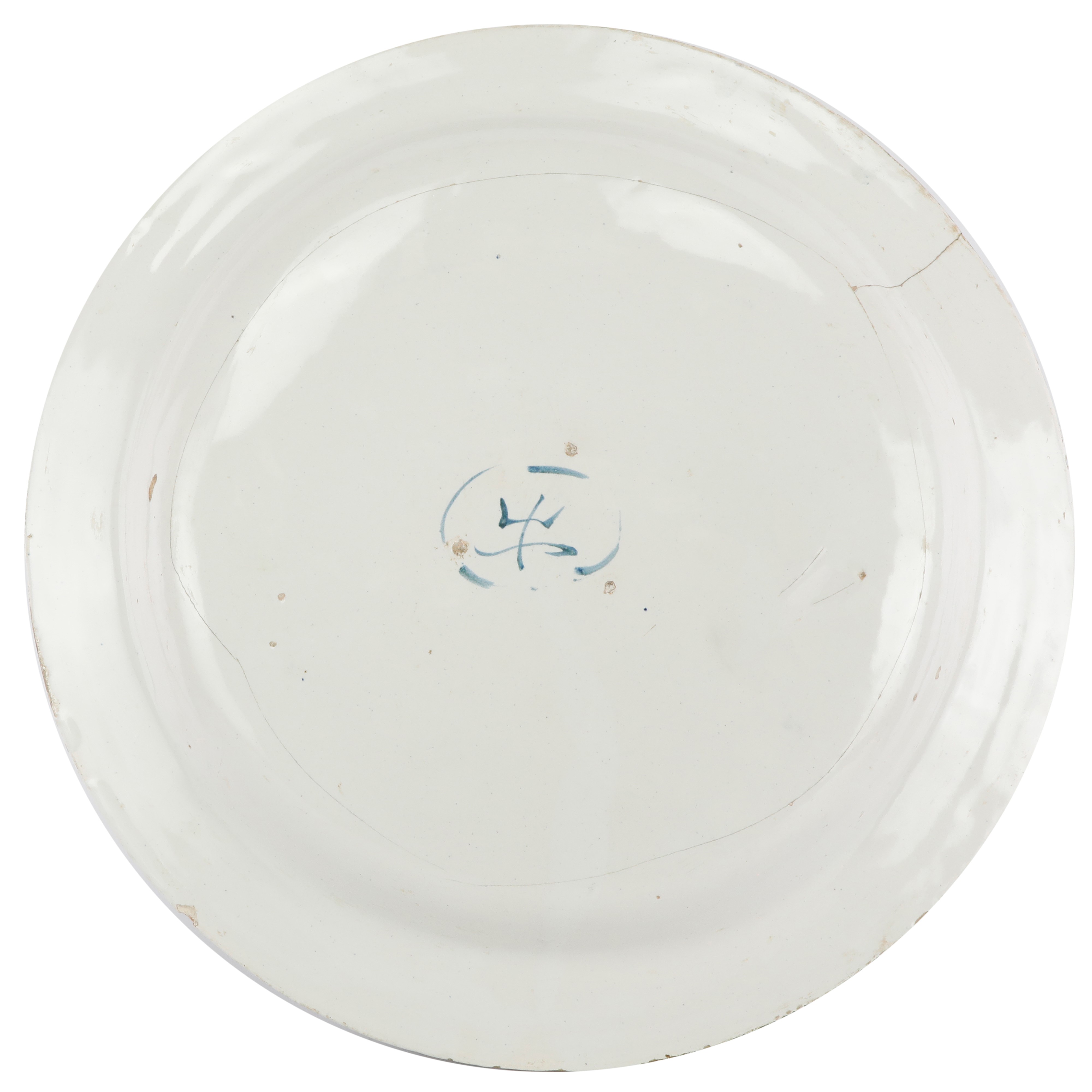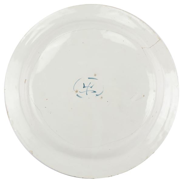 Floral decoration on a white background on the border and a scene of soldiers with cupid within a landscape on the interior. white, light blue, ocher and manganese brown colors. On the reverse a blue trident mark.