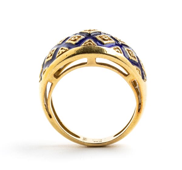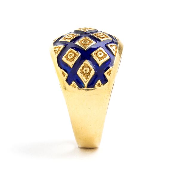 18k yellow gold, decorated with small flower geometric motives on a blue enamel layer.