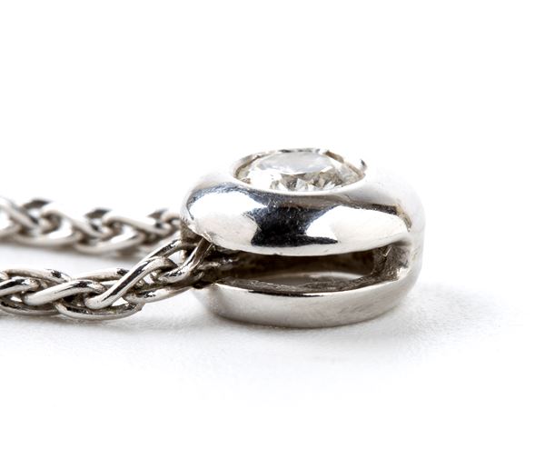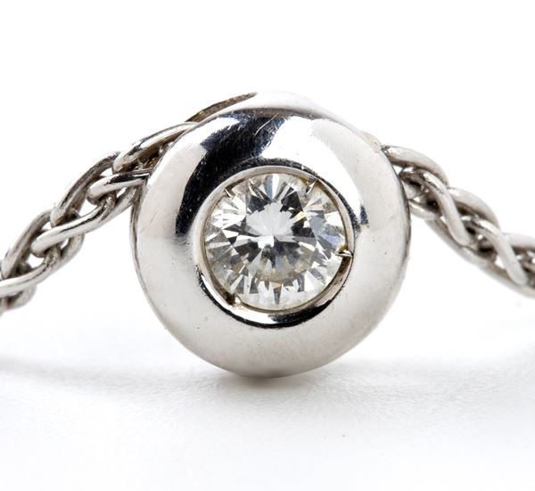 18k white gold spike-link chain from which a diamond-set pendant is suspended.