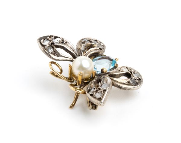 Diamond pearl aquamarine insect-shaped gold and silver brooche, Inizio XX secolo