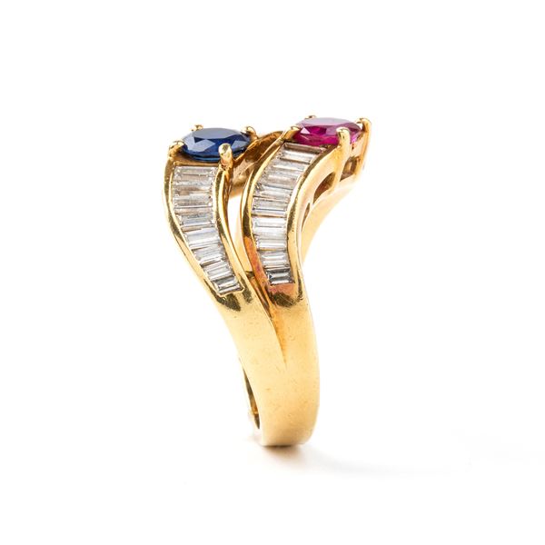 with 18k yellow gold double wave pattern, set with ruby and blue sapphire flanked by diamonds.