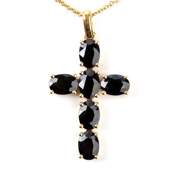the necklace consists of a fine "rolò" link chain and two pendants: a Latin cross made of oval-shaped black sapphires and a carved onyx rose. Another rose made was inserted as a terminal in the chain. An oval plaque placed between the chain and the clasp bears the ‘DOLCE&GABBANA’ logo.
