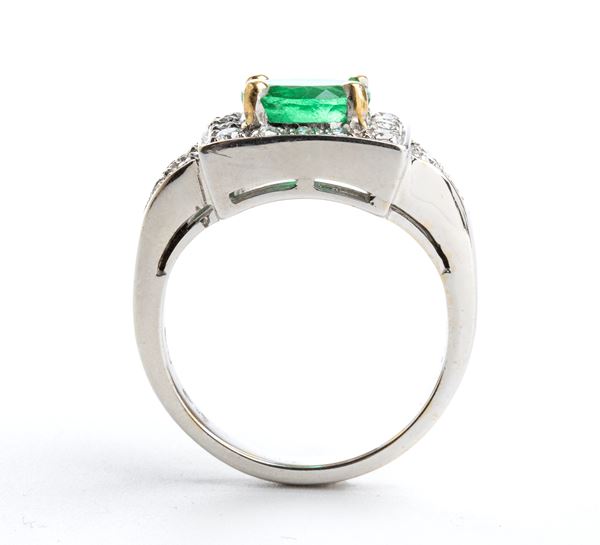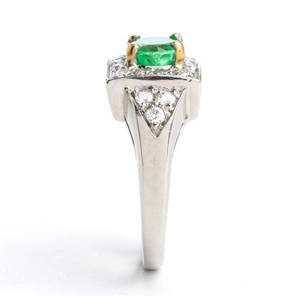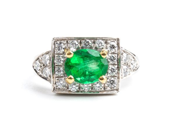 18k white gold, set with an oval emerald surrounded by pavè set diamonds.
