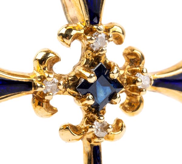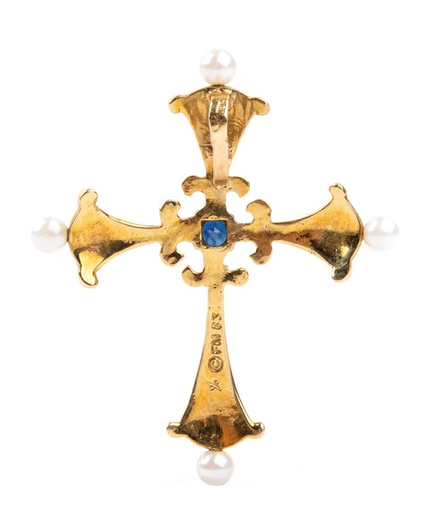 one of the most beautiful pieces from the "Franklin Mint" Jewelry Collection. The Igor Carl Faberge's "Midnight Sapphire Cross", executed in 14k Yellow Gold, embellished by blue enamels, pearls, blue sapphire and huit-huit cut diamonds.