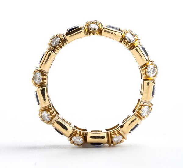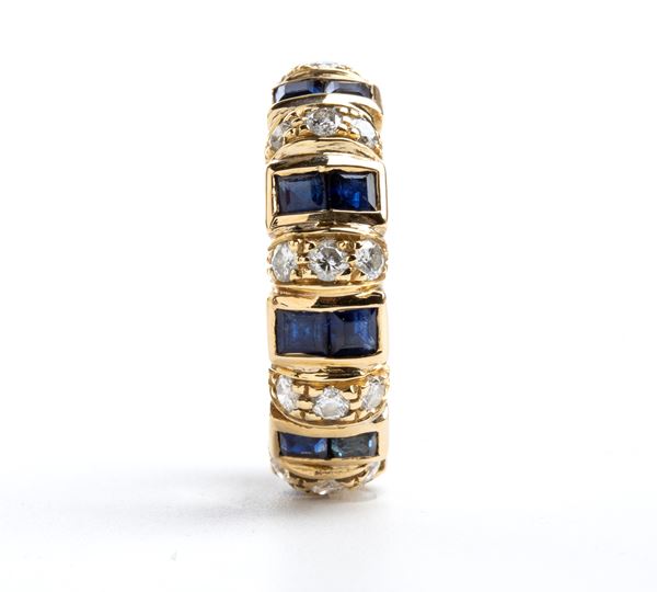 18k yellow gold, set with a line of pairs of sapphires separated by three diamonds. Signed F. MORONI.