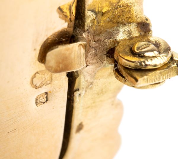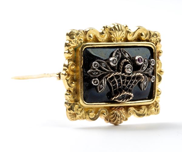 rectangular shape, central glass paste with silver flower basket motif, between yellow gold frame.