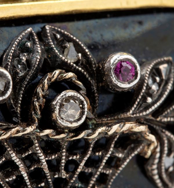 Small rose-cut diamonds and ruby punctuation.