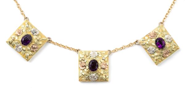 geometric elements decorated with small floral motifs in three color 18k gold, set with oval amethysts.
