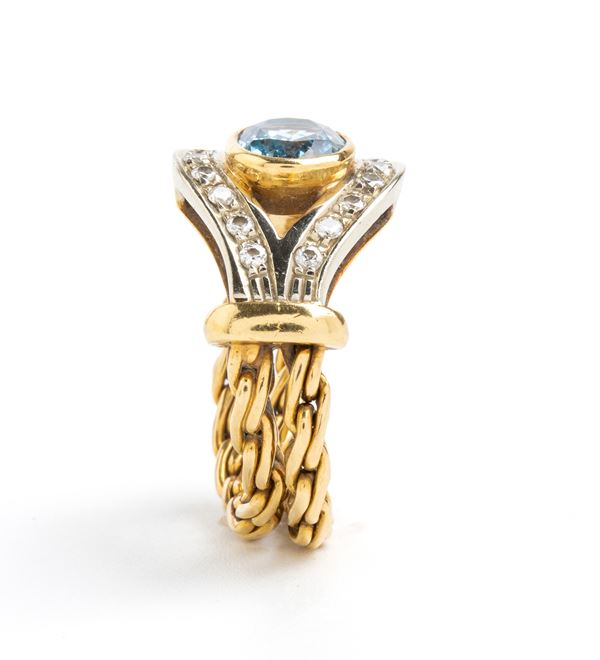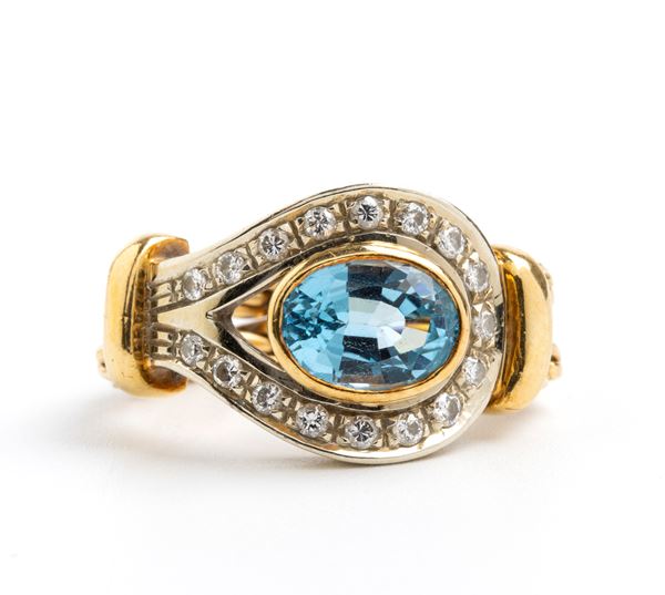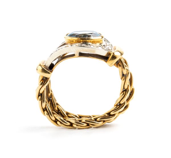with buckle motif, fashioned as a band with double braided chain, set with aquamarine surrounded by n. 17 diamonds, round shape, brilliant cut, approx. 0.35 ct, G-H, VS.