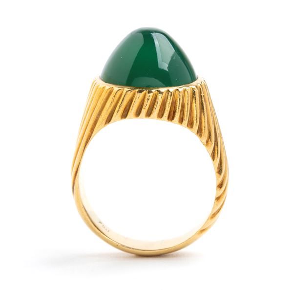 18k yellow gold, band setting with knurled finish, set with cabochon cut chrysoprase.