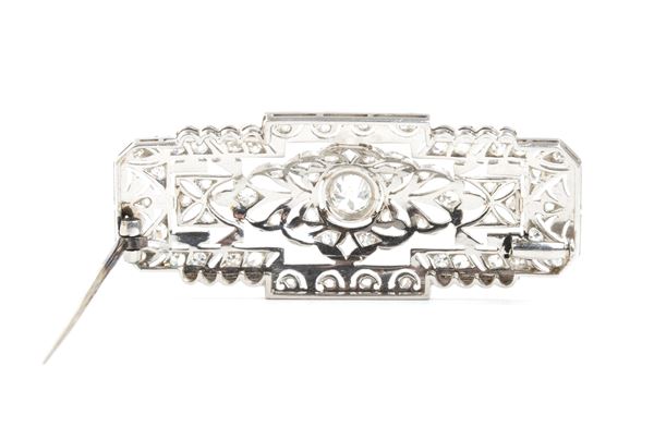 lozenge shape with openwork plate floral motifs, embellished with a central brilliant-cut diamond, approx. 0.35 ct, G-H, SI, surrounded by other rose-and huit-huit cut diamonds.