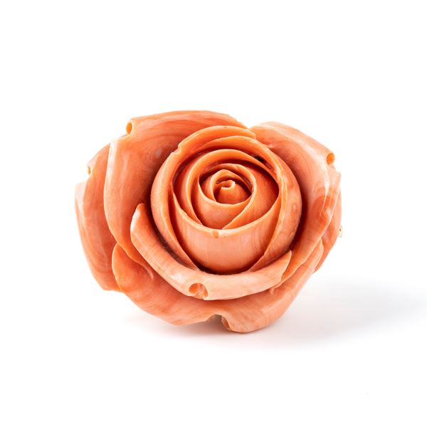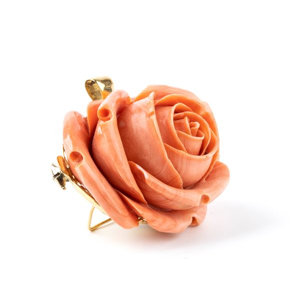 Gold pendant brooch with carved cerasuolo coral depicting a rosebud