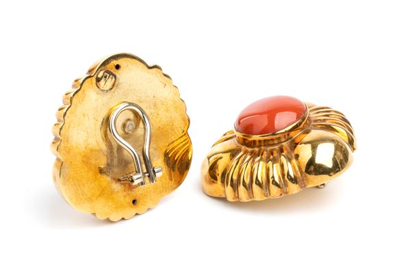 18k yellow gold ribbon pattern, set with cabochon cut red Mediterranean coral (Corallium Rubrum).