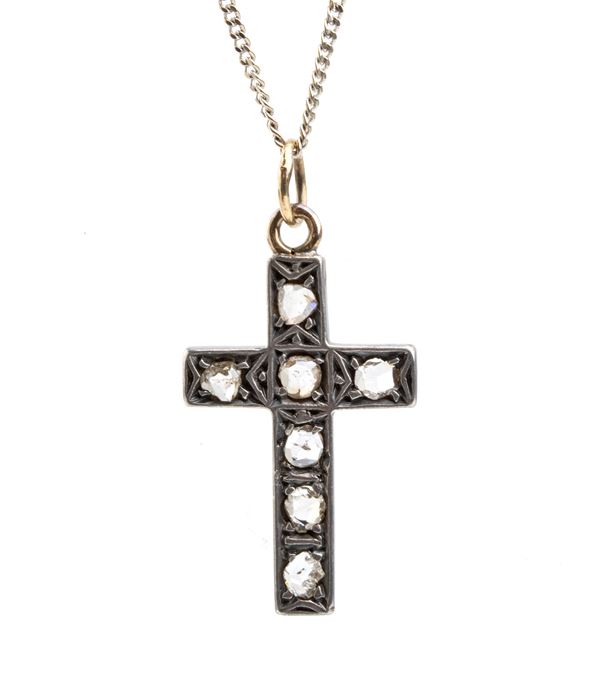 silver, low title yellow gold cross pendant set with rose-cut diamonds and 18k white gold chain.