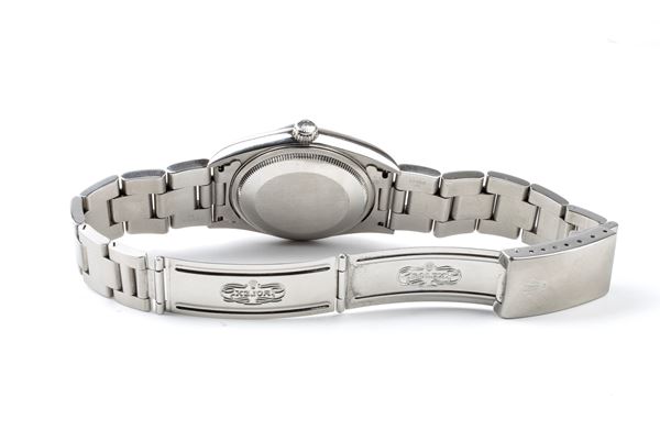 Steel case and bracelet, silvered dial, veined yellow, with traces of oxidation and sapphire crystal.