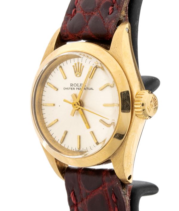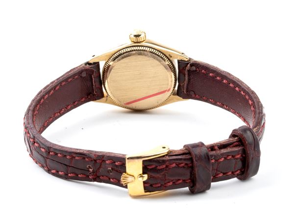 18K gold case, silvered dial with baton hour markers and gilded straight spheres and plastic crystal.