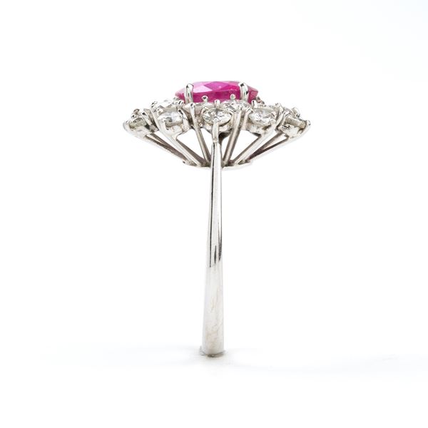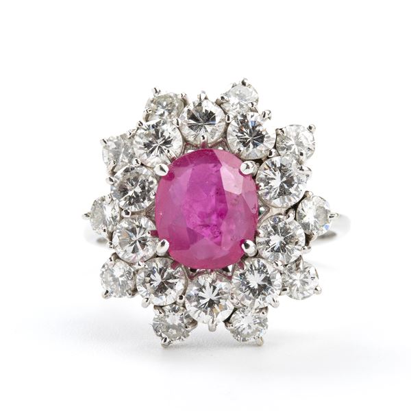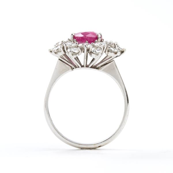 18k white gold, set with a central ruby between a double frame of diamonds.