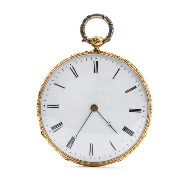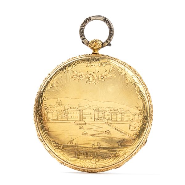 Sold gold case engraved with a landscape along a river, white enamel dial with Roman numerals and gilded hands.