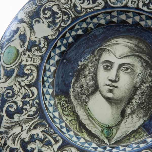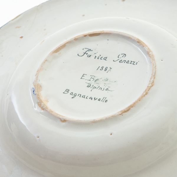 with a wide brim with slightly lowered hem, short flounce, and flat bottom. Decoration on the frill with phytomorphic spirals and fantastic figures. In the center of the plate there is a portrait of a young girl identifiable with the writing on the back. Penazzi manufacture