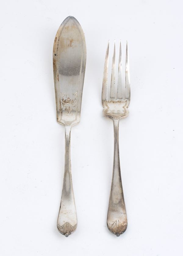 in silver metal for fish with original wooden box. Total pieces 24.