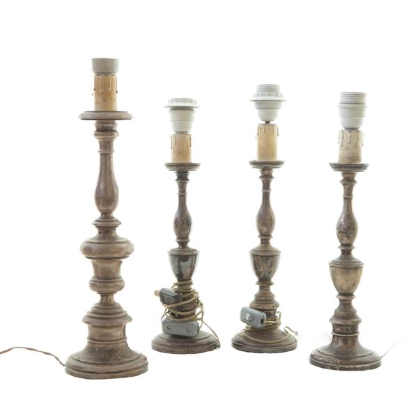 Four spool-shaped freestanding lamps in 800/1000 silver foil, mid 20th century