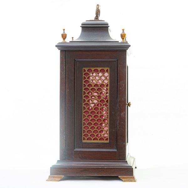 wooden case, with a rectangular front line with broken arch, lateral sides and brass lattice back. Four shelf-supporting feet and carrying handle. Circular dial in silver metal and gilded bronze, with two holes for winding the hours and the chime, with double numbering in Roman and Arabic characters. Perforated metal hands, with alarm hammer on bronze bell. Mechanism with steel plate suspension and pendulum regulator. Machine not tested, suspension foil broken.