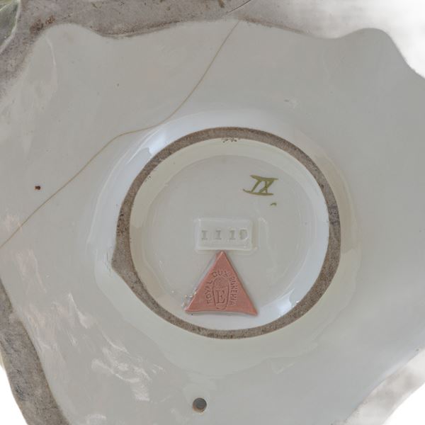 in porcelain with a tub-shaped base on a high rocky spur from which the two characters emerge. Base with phytomorphic finishes. Ivory and rotten green colored ceramic.