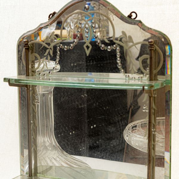 Lot of four objects: two bottles, one centerpiece and one mirror with shelves, 20th century