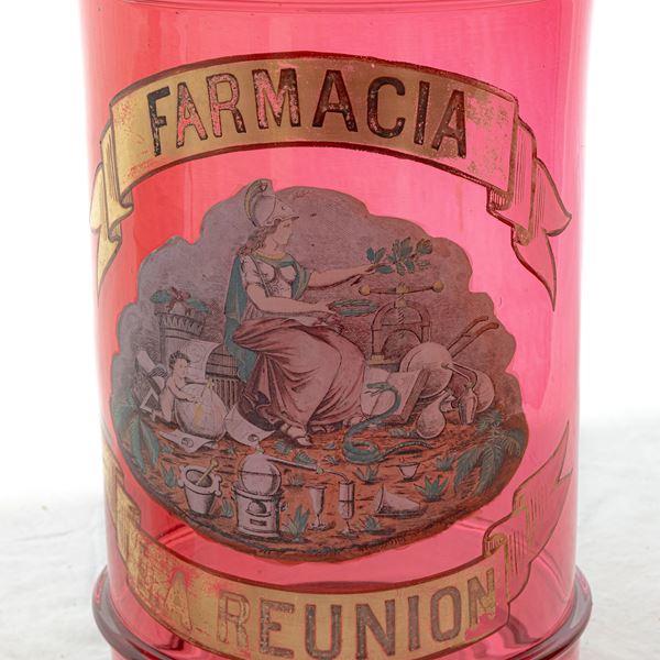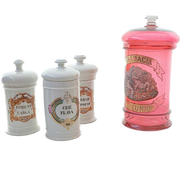 of which: one in red glass with cylindrical body and lid with knob handle 40 x 18 cm; three albarelli in white porcelain with cylindrical body and lid with knob handle, 26 x 12 cm. , and decoration within the central reserve with the name of the essence and the name of the pharmacy