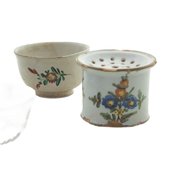 a tray with a ribbed body with landscape scenes and characters 11 x 9 x 4.5 cm;  cylindrical flower holder with flower decoration on a light blue background 5.7 x 6.2 cm; Bell-shaped cup with floral decoration of potato flowers on a white background 7.8 x 4.3 cm.  Manufactures of Liguria and Emilia Romagna. the fourth ceramic is a  bell-shaped coffee cup with "rose" decoration  to the small fire on a white background initialed at the base Ferniani, Faenza, last quarter of the 18th century 8 x 5 cm.