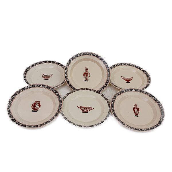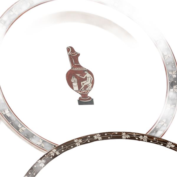 with floral decoration on a black background along the edge of the rim and in the center of the bottom, reproduction of a vase taken from the antique.