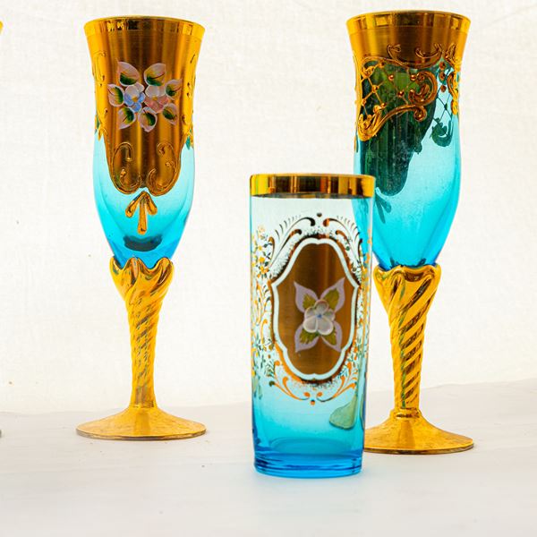in blue glass with pure gold decoration and floral motifs in two different shapes and sizes: 12 cylindrical glasses 11.5 x 4 cm; 12 stemware glasses 19.5 x 6 cm.
