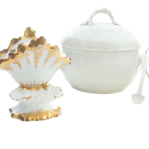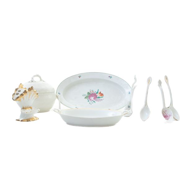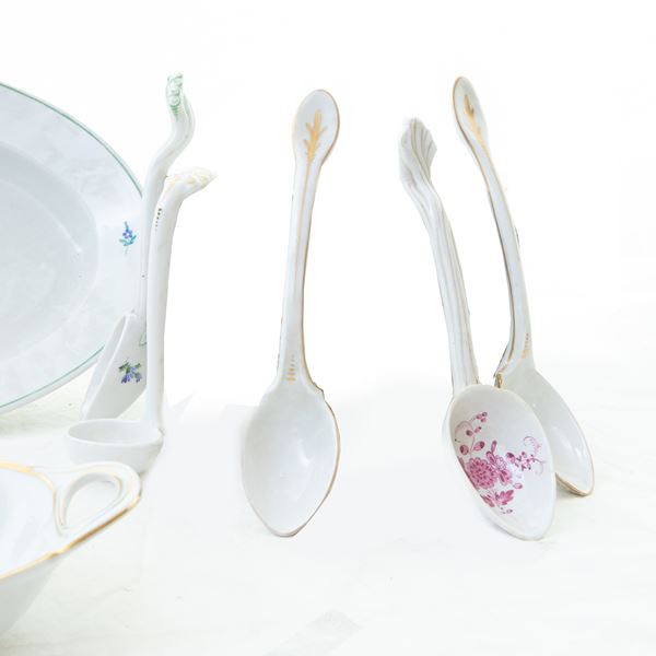 in white porcelain with flower and fruit decorations. Finishes in pure gold, in different sizes and shapes, 10 pieces