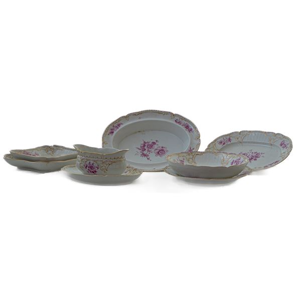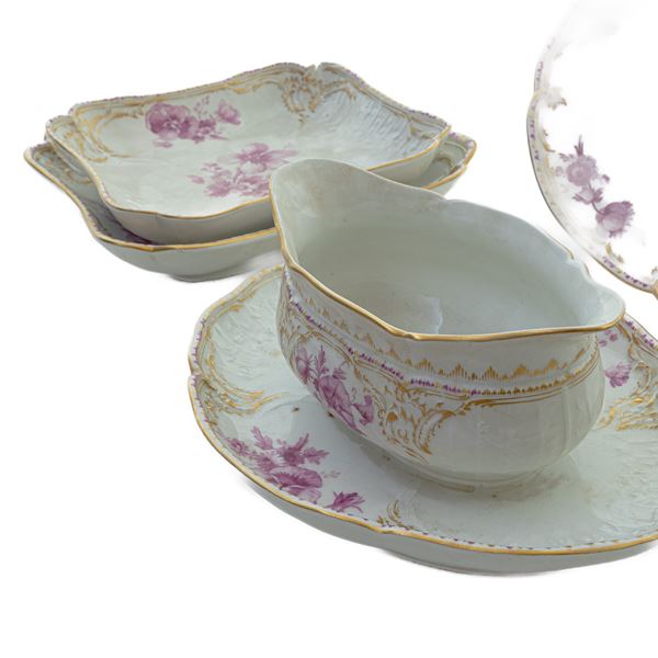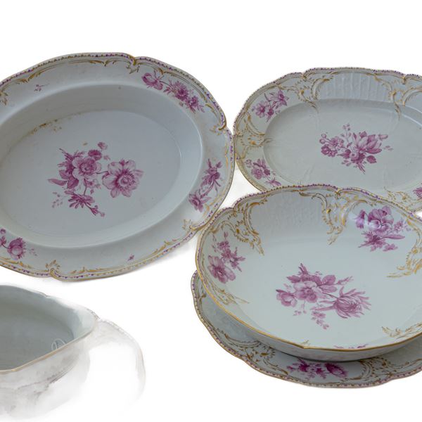 with floral decoration in Cassian purple with raised and edges in pure gold composed of: 30 knife plates with mixtilinear edge, part in relief and part with decoration, diameter 25 x 3 cm; 4 melted bowls en suite diameter 24 x 5.5 cm; 2 oval trays 31 x 24.5 x 6 cm; 28 x 20.5 x 4cm; 2 quadrangular trays 22.5 x 4 x 22.5 cm; 20 x 4.3 x 20 cm and 2 gravy boats 18.5 x 9.5 x 8 cm. Imperial Berlin Manufactory KPM with scepter and orb