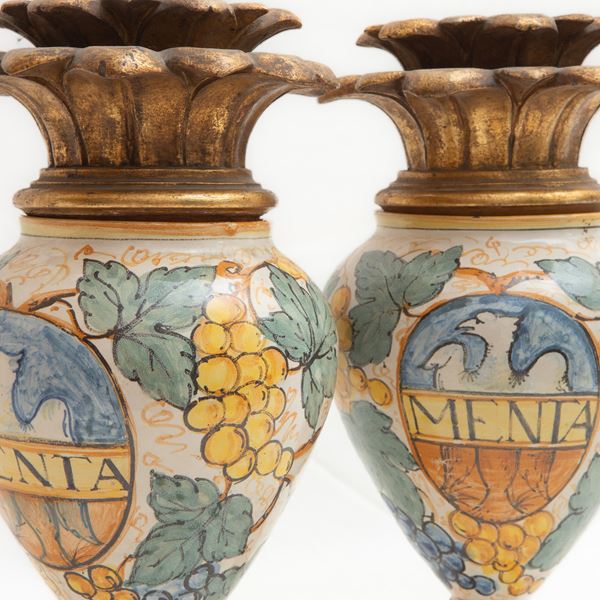 Pair of polychrome ceramic vases, Italian production, first half of the 20th century