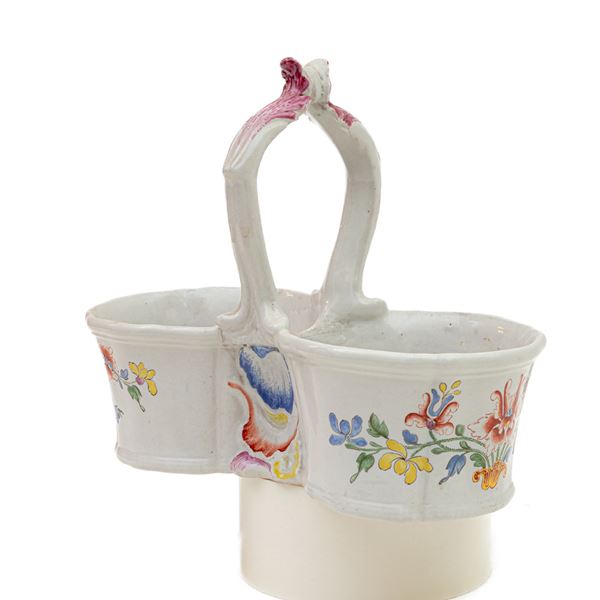 basket-shaped, with a ring grip with leaf elements and two round basket-shaped basins with a slightly everted edge and joined in the center by two shell motifs. "Tulip" decoration with racemes and inflorescences scattered on the white background.