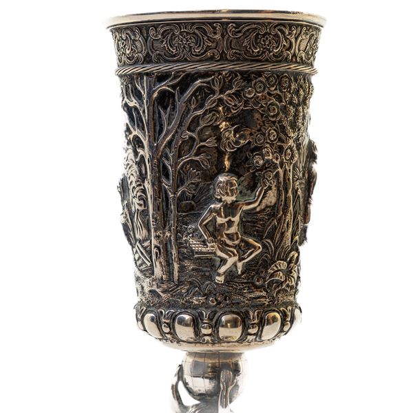 with Atlas on a circular pedestal holding the world on his shoulders, which in turn holds a chalice chiselled with allegorical relief figures of the harvest and the harvest. Gr. 368