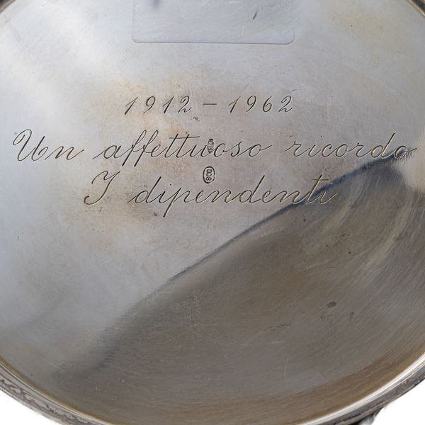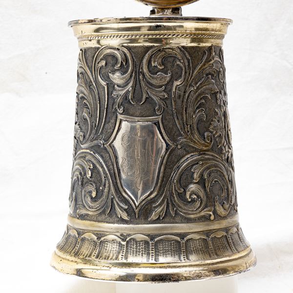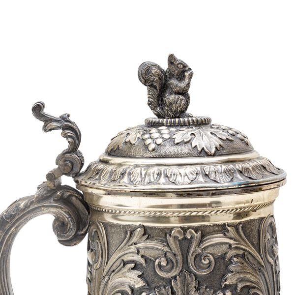 with vermeille interior, sculpted parts, engraved with floral and raceme motifs, comma grip, lid ending with squirrel sculpture. At the base dedicatory inscription gr. 967
