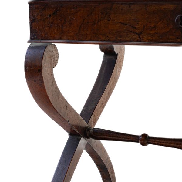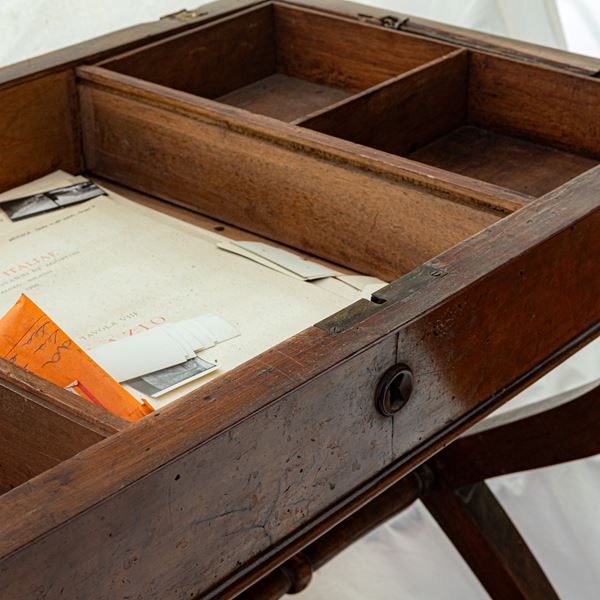 with legs crossed connected to the base and compass top with drawer with compartments underneath.