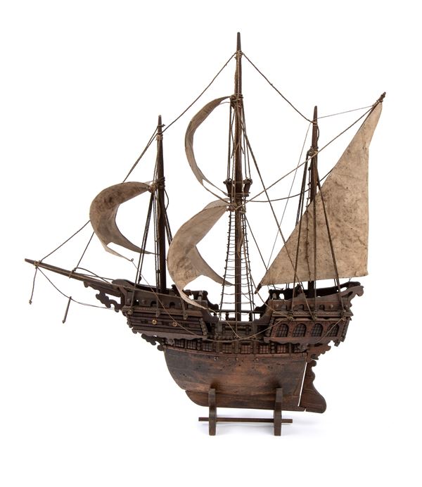 Wooden model of one of Christopher Columbus' caravels; Wooden base and waxed paper sails decorated with a cross; Good condition, complete with all pieces.