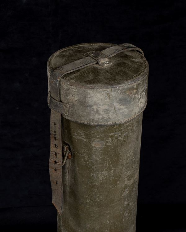 Cylindrical container, in leather, wood and waxed canvas, for storing tripod. Marked in capital letters RCR